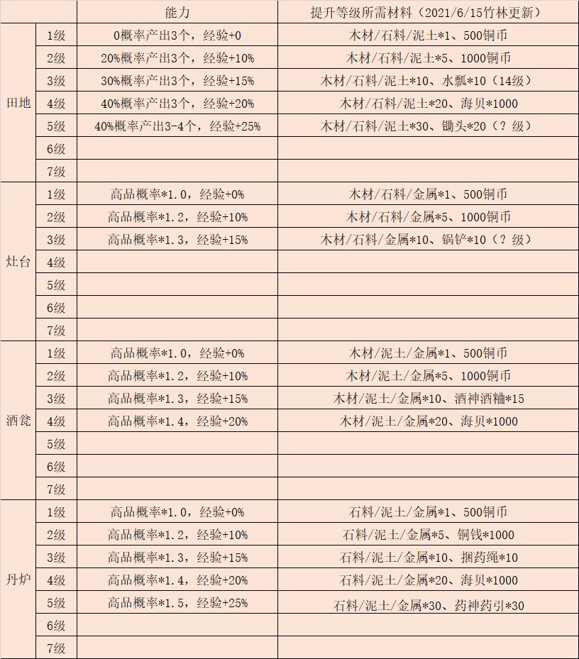 酒瓮和灶台,如果平常都注意的话,一般经验是溢出的,可以缓缓。但是升级会加出神品的概率,自行选择把。