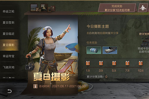 夏日摄影:幸存者可每日领取1个随机摄影任务,拍摄指定照片并分享可以获得任务奖励;累计分享一定的次数,可以获得累计奖励。