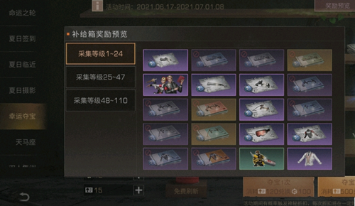 幸运夺宝:6月17日-7月1日8点,消耗集训证书可兑换100新币并获赠1次夺宝机会,有机会获取风纪委员自选箱、配方:斩马刀、配方:雷托霰弹枪等道具。