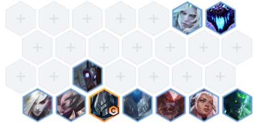 正常拉人口2-1拉4,2-5拉5,3-2拉6,4-1拉7,快速到7后,D出1只武器,凑出3铁甲3神盾,阵容初步成型后开始攒钱上8级,5-1拉8,D牌找2星武器和芮尔,能D出佛耶戈,千珏最好,没有的话就用潘森和璐璐代替。九人口可以补诺手凑2骑2黑夜。