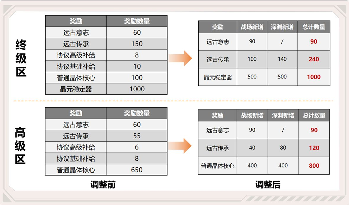 由于赛季系统奖励的加入,深渊与记忆战场的次数/结算奖励也将进行增加调整,具体的调整如下: