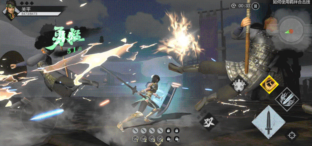 无双乱舞,高举剑盾持续冲向前方,冲散沿途的敌人,可造成880%攻击力的伤害。