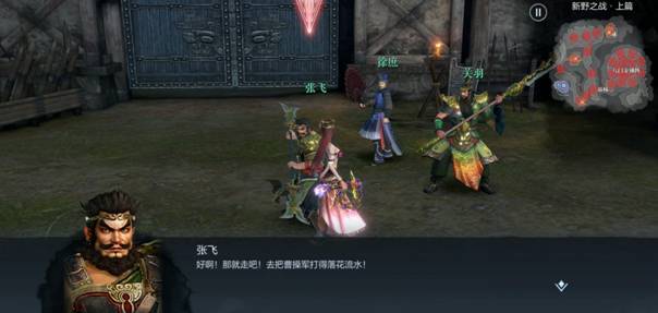 在新野之战上篇,除了小霸王们带领的三位战将出战之外,系统还补上了徐庶、张飞和关羽三员大将,足可见战局的难度。进入战局,与张飞谈话后即可出征。