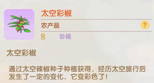 太空彩椒是种植太空辣椒时,有一定概率获得;在成熟的时候太空彩椒会呈现不一样的外观,虽然不是很明显但是的确有区别。
