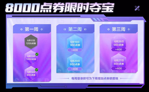 在6月12日-6月27日期间,车手们每周末在线登录即可领取对应点券,最高可领取8000点券。当周登录领取点券,即可为下周增加点券额度。最后一个周末,车手们快来领取更多点券吧~