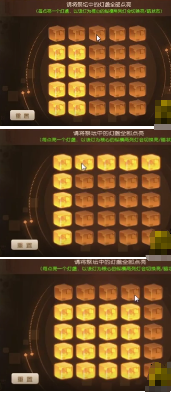 玩家需要将祭坛中的灯盏全部点亮(每点亮一个灯盏,以该灯为核心的纵横两列灯会切换亮状态)