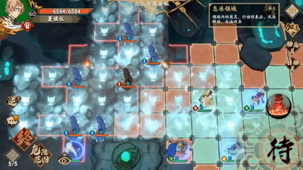 这一关需要我们在1回合内通关,整体的打法思路是先用古伦德将冰璃面前的2个蜈蚣击退,然后慕容璇玑将挡路的一只冰系蜈蚣干掉,然后夏侯仪向前利用【连绵焚炎】融化冰系地形,接着冰璃往右上方移动,再借封铃笙的再动用【避实就虚】攻击炎系蜈蚣触发剑使再动,最后用【冰华飞刺】突击到boss身边的蓝色格子中即可通关。