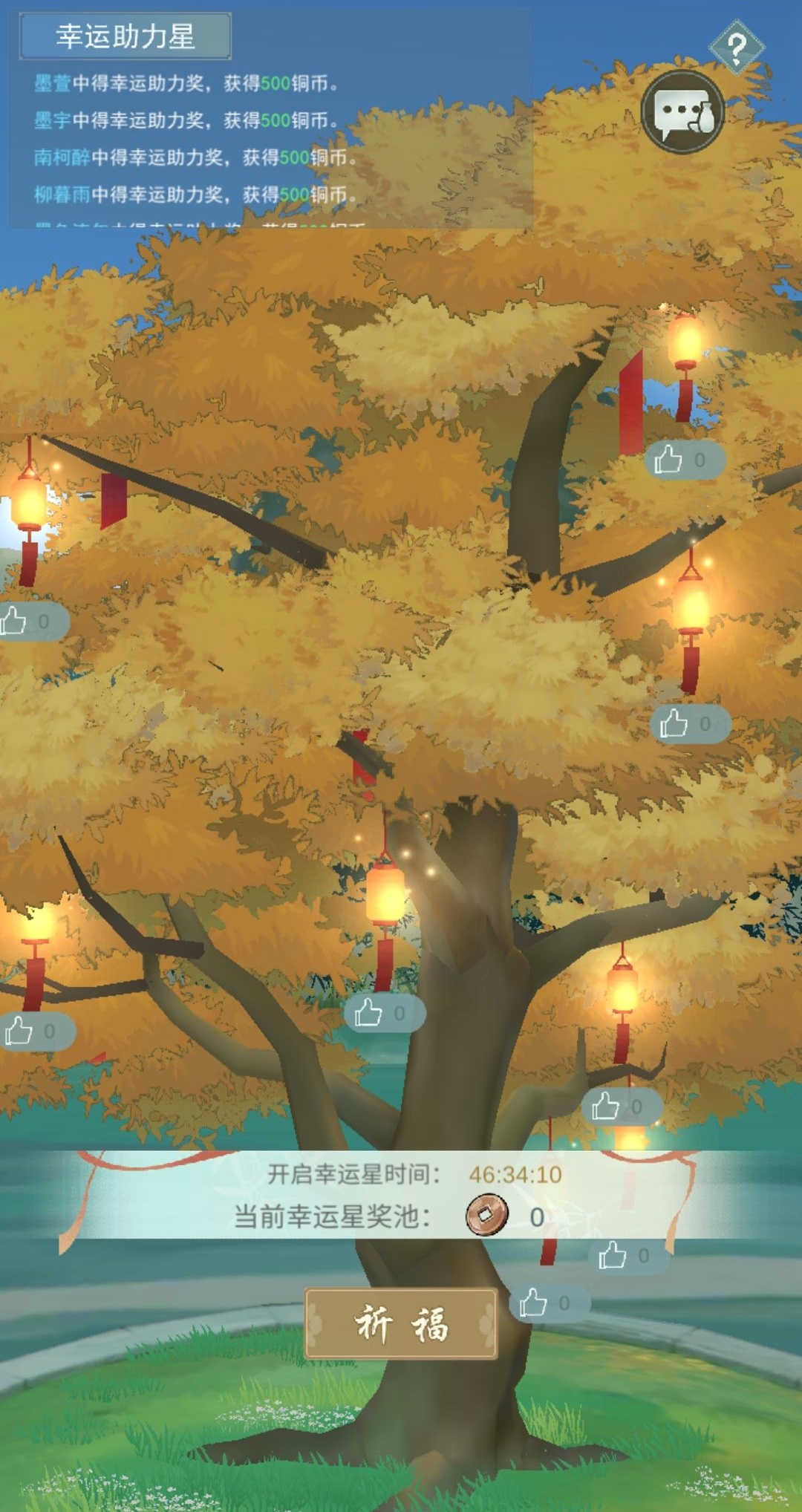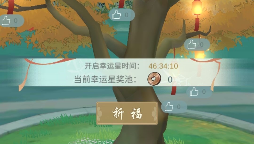 村民可挂心愿单于祈福树上,其余村民可花费500铜币为该村民助力。所花费的铜币都会进入奖池。