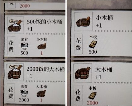 五百木板换小木桶,小木桶+五百饭换小饭桶;