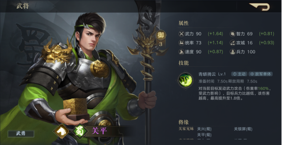 关平的输出能力在前期勉强够用,配合马岱技能的普攻增伤效果,以及刘备的强大辅助能力,勉强是够用的。