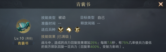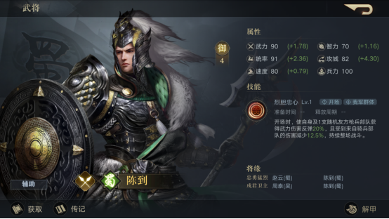 而陈到的技能效果可以让自身和另一位枪兵系将领获得武力伤害反弹效果,并且减免受到骑兵队的伤害,这样刘备和陈到就可以放在前排抵挡伤害。