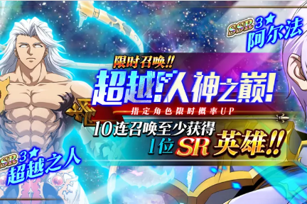 限时召唤「超越!人神之巅!」中SSR级英雄阿尔法、超越之人出现概率提升!