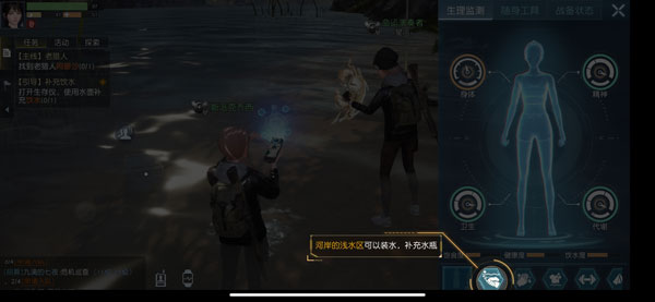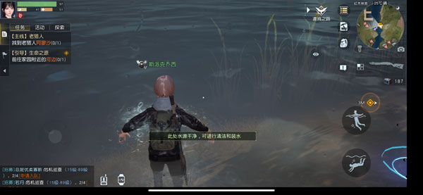 2、达到河边之后,在浅水区域会提示【此处水源干净,可进行清洁和装水】,这时候打开左下角的生存记录仪;