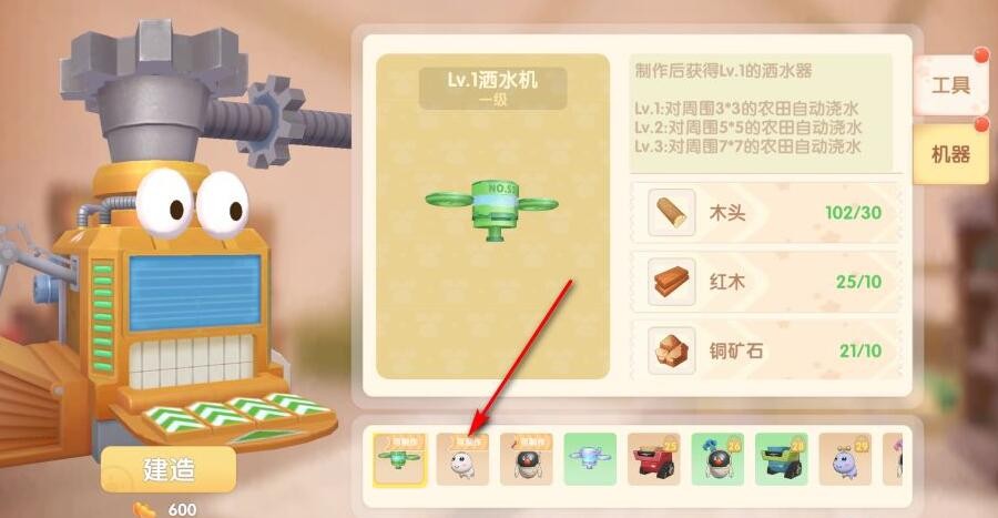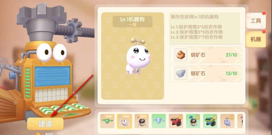 5、选中机器狗后再点击页面左侧的【建造】功能,这时消耗铜矿石×10、银矿石×10就能成功制造出机器狗了。
