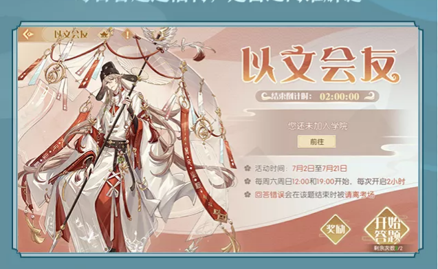 与状元及第粥一同参加聚会,争夺魁元!答对的题数越多,获得的奖励越丰厚!答题奖励将根据答对的题目数量在结算时发放,请少主们努力争取好成绩哦~相同学府的玩家获得的答题积分将会累加,结束之后积分多的学府获胜;若两个学府总积分相同,则同为胜利方,同时获得获胜者奖励。