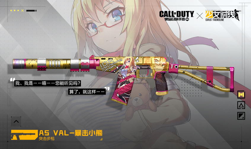 使命召唤手游将会在7月份开启与少女前线的联动活动,那么其中联动皮肤ASVAL暴击小熊到底怎么样,相信还有很多小伙伴不清楚,对此游戏爱好者小编特地为大家准备了相关的详细内容,让我们一起来看看吧!