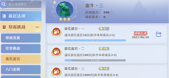 帮派成就可以通过完成各项任务来获得,作为帮派的管理人员,应该有组织性的去提醒帮派成员完成,比如下图中有些任务是需要队伍里本帮人数≥3个才能完成的,也鼓励帮里的队员互相组成固定队。