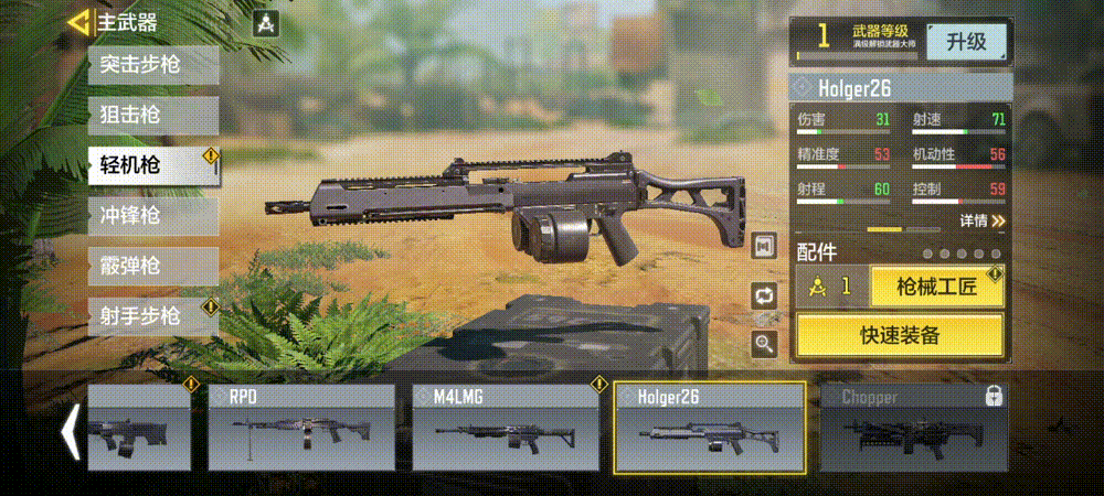 中远距离武器则推荐赛季新武器Holger26。作为一把各方面属性都超强的机枪,Holger26无疑是现版本中最适合中远距离持续输出的武器,带上金属被甲弹就可以对一些室内点位造成有效穿透伤害。