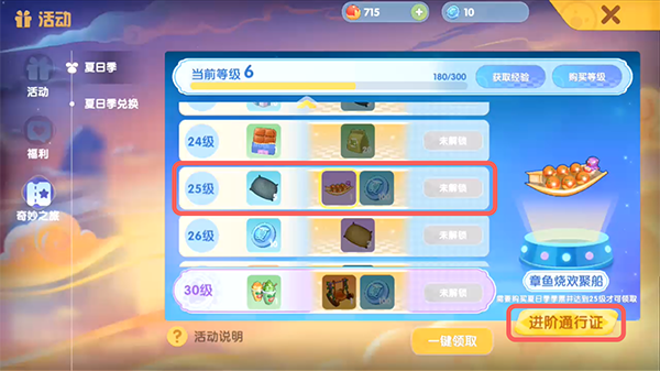 3、点击右下角的【进阶通行证】,花费30元购买季票,当等级达到25级可直接领取到该家具;