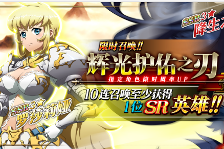 限时召唤「辉光护佑之刃」中SSR级英雄降生之光、罗莎莉娅出现概率提升!