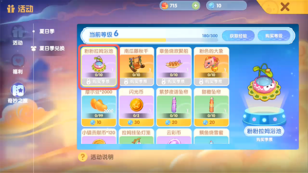 3、在【夏日季】活动中,点击右下角花费30元购买【夏日通行证】也就是夏日季票,提升等级至40级即可获得该家具;