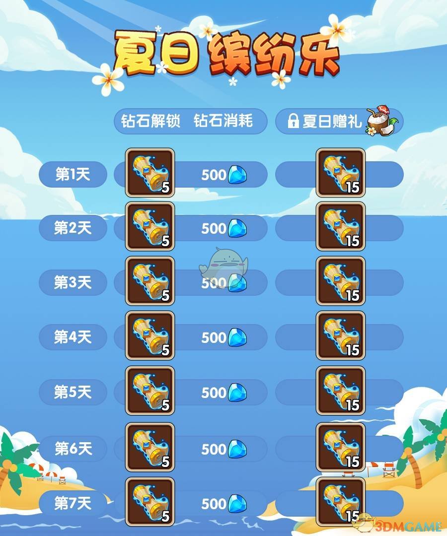 活动期间,夏日缤纷乐将每天解锁一份礼物,大家可消耗钻石进行购买。另外,购买夏日赠礼还可解锁夏日缤纷乐的额外奖励~
