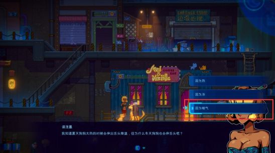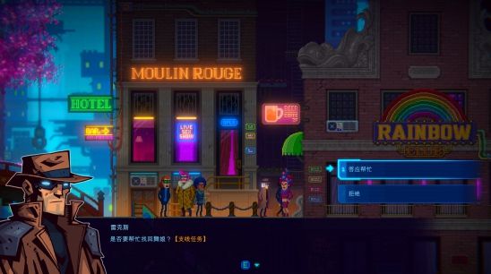 我们跟着主线走到花夜下町后,一路往左走,会看见一个带着VR眼睛的女人,她就是第二位舞娘。和她说话得知,想让她回到彩虹俱乐部就需要找到她打游戏时忽然掉线的朋友。