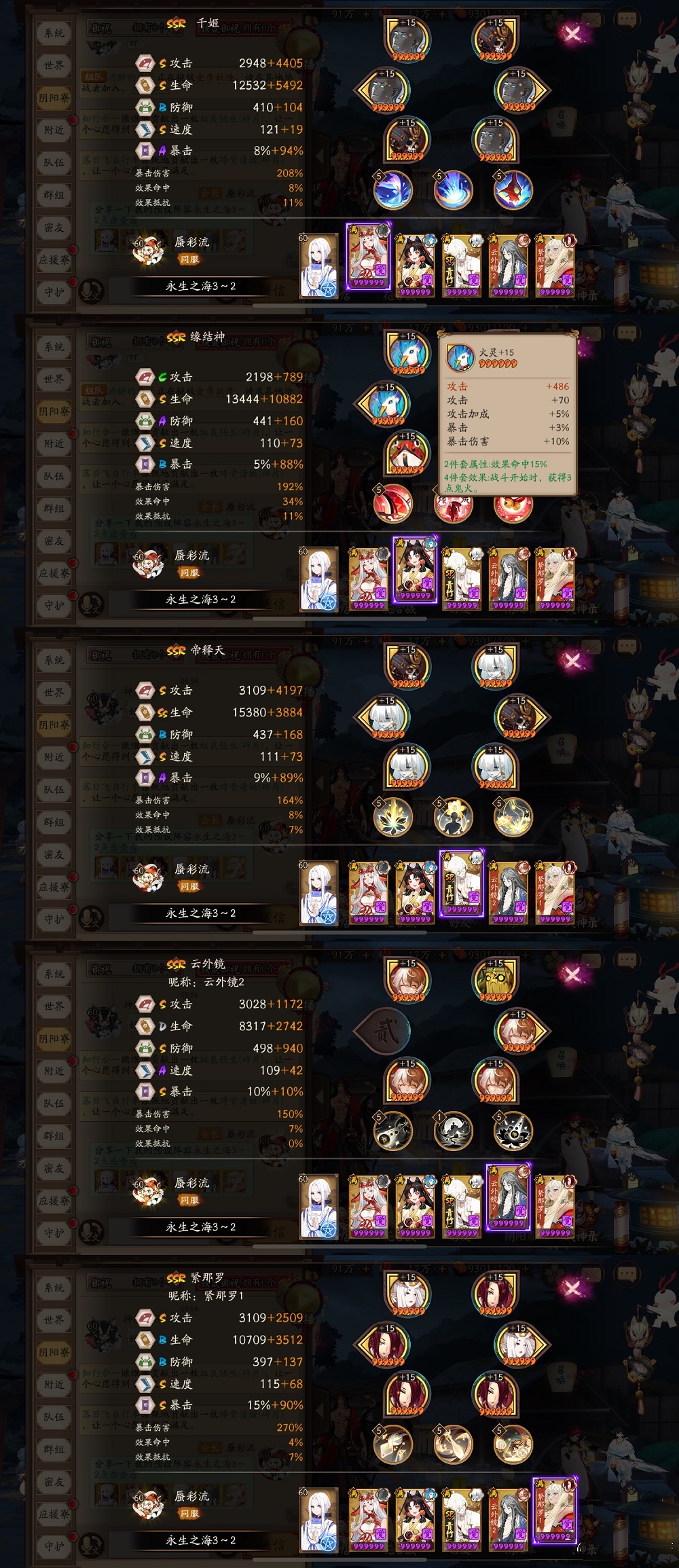 按配速:千姬(涂佛,速攻暴),云外镜(招财+蜃气楼,速生防),紧那罗(狂骨+土蜘蛛,速攻暴),蝎女(招财,攻攻攻),缘结神(火灵+蜃气楼,生生暴)