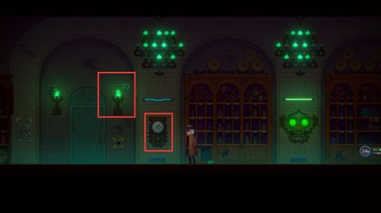 来到挂钟处,注意墙上的绿火照应出的数字:11、04、09,记下。现在我们有两组数字了。