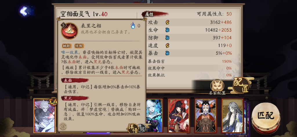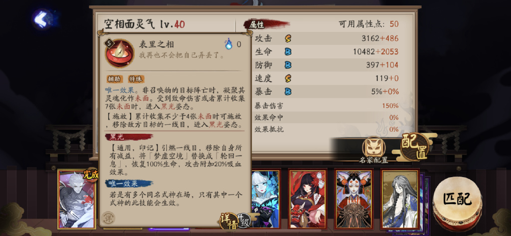 唯一效果。非召唤物的目标阵亡时,凝聚其灵魂化作未面。受到致命伤害或者累计收集7张未面时,进入黑光姿态。