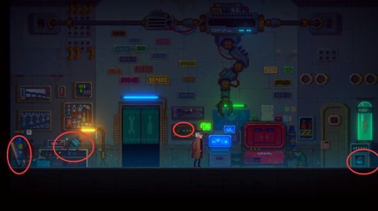 来到最左侧红圈获得【撬杆】,红圈处桌子上获得【改造中的漩涡引擎】,中间红圈处获得【激光枪火控器】右侧红圈处获取【蓄电器】。