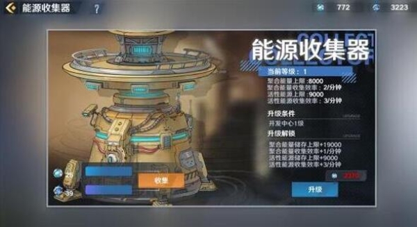 初始状态下1级的时候能源收集器储存上限为聚合能量8000 (每分钟获得2点),活性能量9000 (每分钟获得3点)。