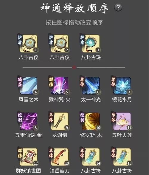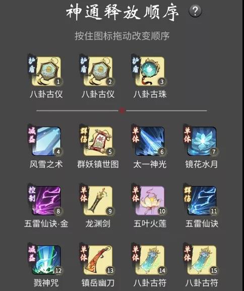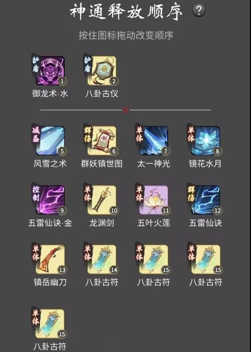 总体思路:起手群攻打灵兽顺便打在人身上,从而避免浪费群攻的多目标。如果起手群攻无法把对方灵兽清除,可延后控制神通,尽量避免把控制打在灵兽身上,其他输出神通法宝古宝一般情况下按照输出高低排序。