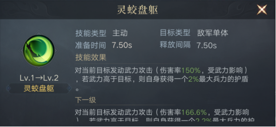 关银屏的技能属于单体伤害,每级的成长还算可观,重点是在于她武力高于对方时能够给到自己一个护盾,能够增加其一定的生存能力。