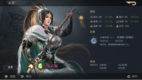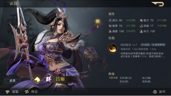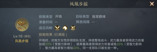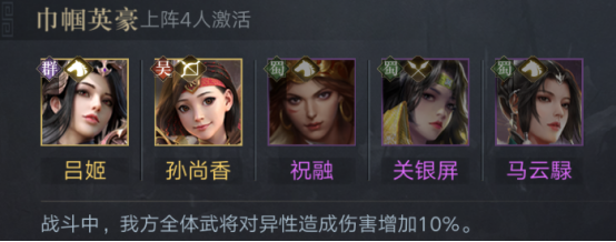 然后再是将缘[巾帼英豪]给到的:对异性武将10%的增伤。这决定了这是一套适合硬碰硬,跟男性武将阵容比输出能力的体系。