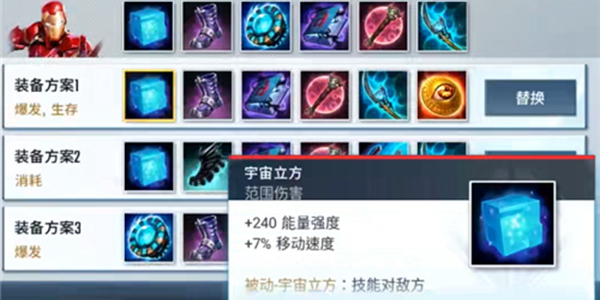 宇宙立方这件装备是必出的,技能命中敌人后,可以额外造成高额的范围伤害,从而大幅提升钢铁侠的输出能力。