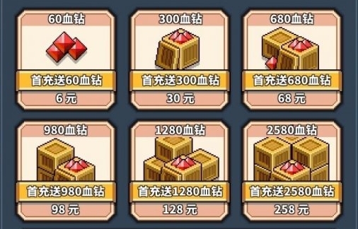 1元兑换10血钻。血钻是氪金货币,玩家可以在充值界面选择不同的充值档位来获取血钻。
