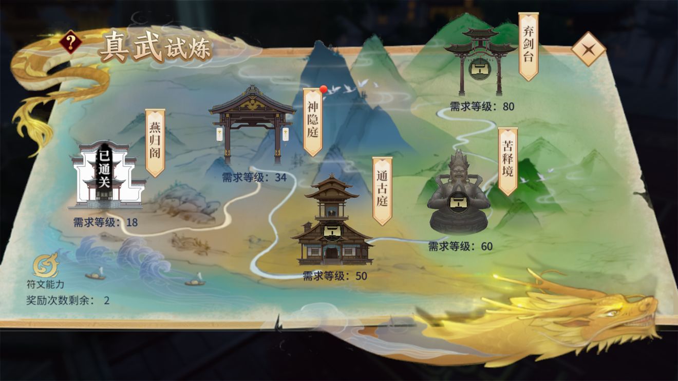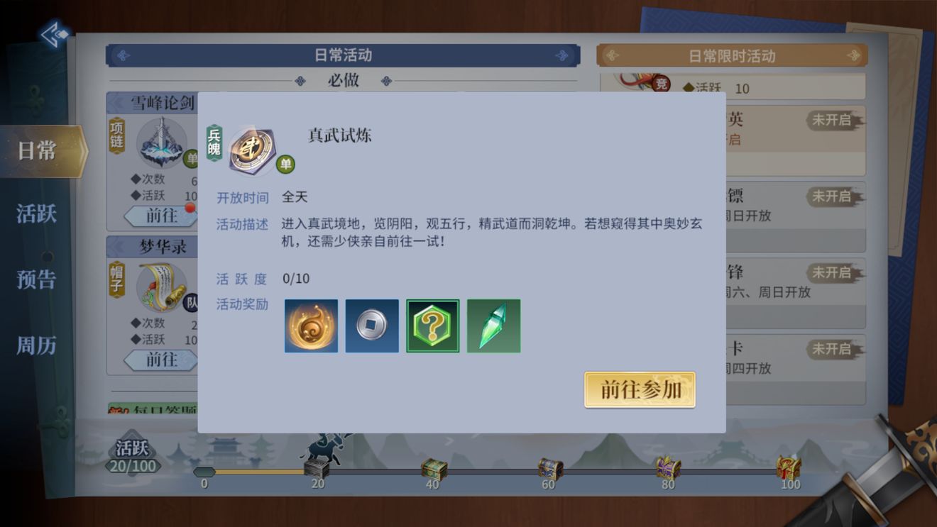 真武试炼是每日个人活动之一。每个未通关卡都可免费挑战2次,免费次数用完之后,挑战未通关关卡消耗每日奖励次数。首次通关可获得[首通奖励],挑战已通关的关卡时可获得[每日奖励]。每日奖励次数与免费挑战次数每天4:00刷新,每日发放2次,不可累计。