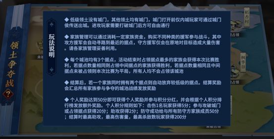 1.领土争夺战是《剑侠世界3》帮会活动的核心玩法之一,活动在开服第四天起每周二、六20:45~21:40开启。需要家族进入排行榜前18名且等级达到40级以上的玩家才可以参加。