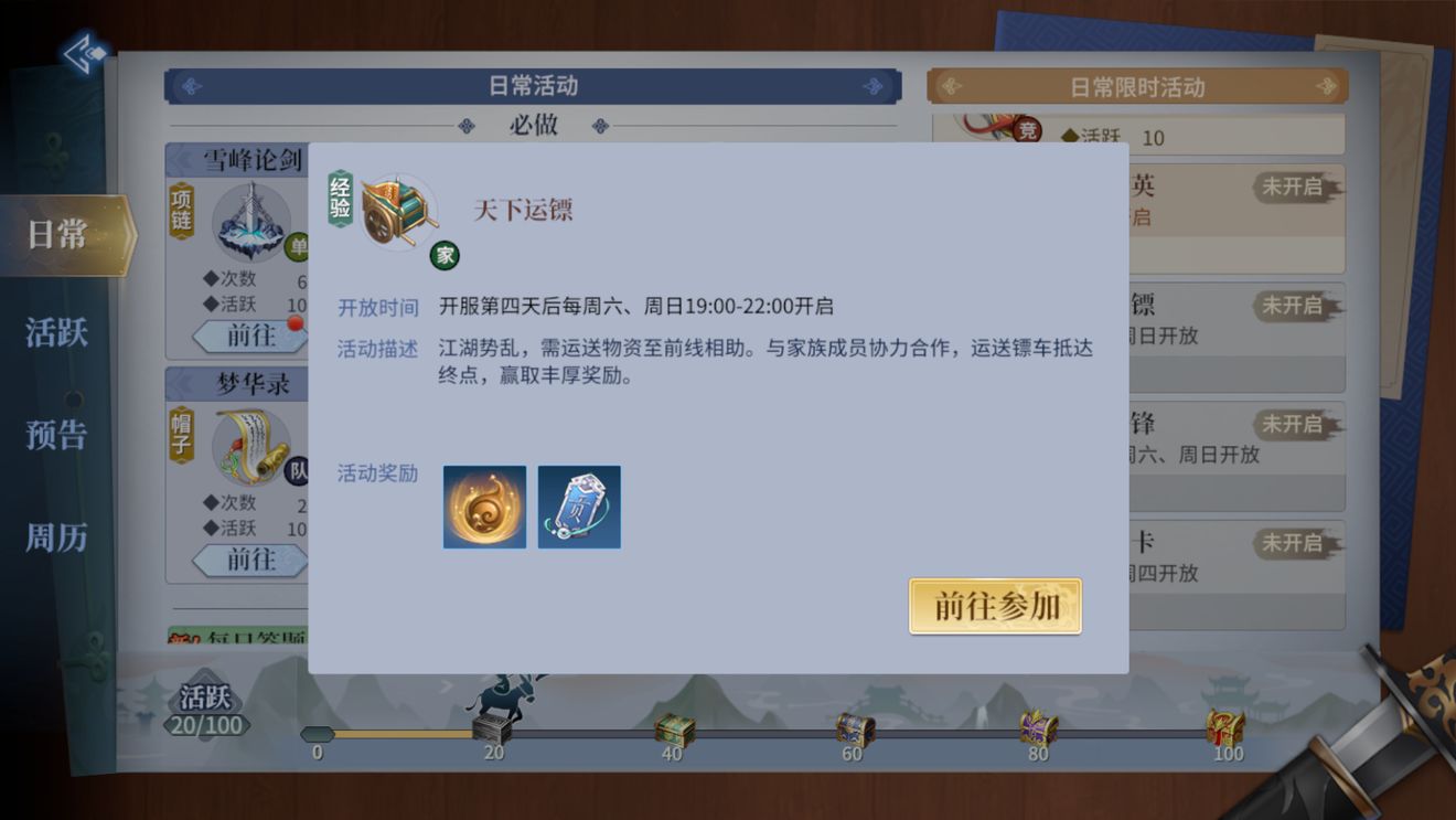 天下运镖是《剑侠世界3》中核心家族玩法之一,颇为讲究配合和协调。活动在开服第四天后每周六、周日19:00~22:00开启。