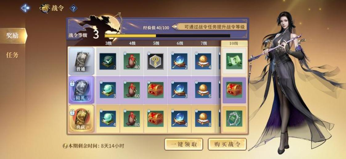 战令的获取方式主要是靠完成各项任务,其中分为月任务和周任务,周任务可以每天做做日常任务来达成,月任务则分为【竞技】【副本】【闲趣】【家族】几个不同的板块。战令系统主要是给侠士们提供一定的资源保障和福利,让侠士们的江湖路上不至于出现资源枯竭的困境,侠士们可以根据自己的情况来衡量是否需要解锁不同类型的战令奖励。