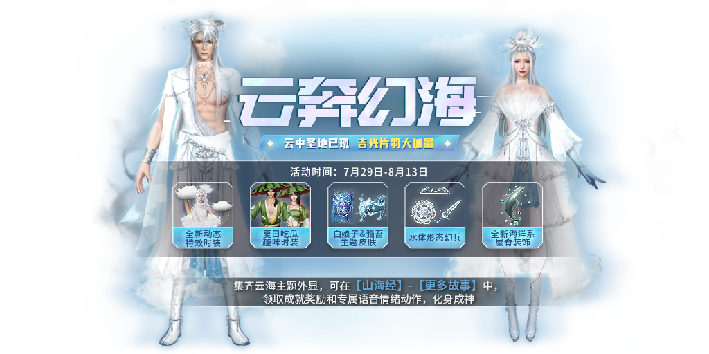 在云中圣地中挖宝可得云奔幻海主题系列外显,包括神品云霓元素时装及角色部件、趣味吃瓜群众主题时装、幻海形态白娘子驺吾宠物皮肤、幻海形态系列幻兵、溟海鲲屋脊装饰等。