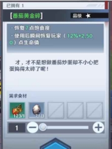 在收集齐了这两种食材之后,小伙伴们就可以着手烹饪番茄黄金碎了。至于这道料理的具体效果,小伙伴们在食用番茄黄金碎之后,将可以恢复7点饱食度,同时可以瞬间恢复(12%+2500)生命值。