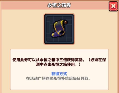 〔永恒之箱券〕其实是开启〔宝箱〕的一大好帮手,该道具可以在你开启〔永恒之箱〕时,获得三倍奖励,其实是非常值得使用的。