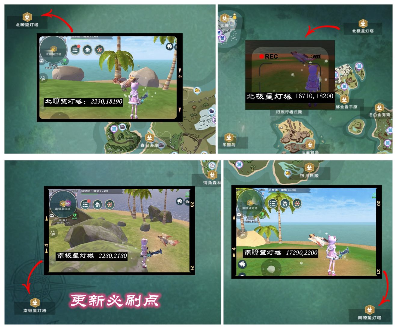 左下角的南极星岛屿(2280,2180)在维护更新时候必刷,其余3个点分别是左上方的北瞭望岛屿(2235,18184),右上方的北极星岛屿(16710,18200),右下方的南瞭望岛屿(17290,2200)