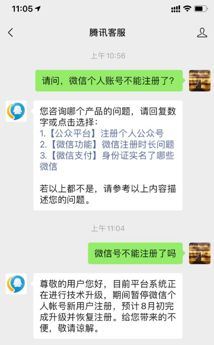 微信个人账号的新用户注册入口已经关闭,无法注册新账户了。不过小编在腾讯客服咨询该问题时,发现腾讯已经为该问题设置了自动回复,其回应称:目前平台系统正在进行技术升级,期间暂停微信个人帐号新用户注册,预计 8 月初完成升级并恢复注册。