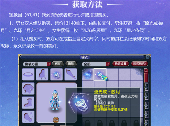 2、在流光使者处可以直接购买七夕戒指,男女双人组队购买价格是13140仙玉。