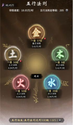 法则压制可以理解为伤害提升百分比,而五行法则等级的提升需要单一法则等级达到升级下限后(每100级),才可以提升。