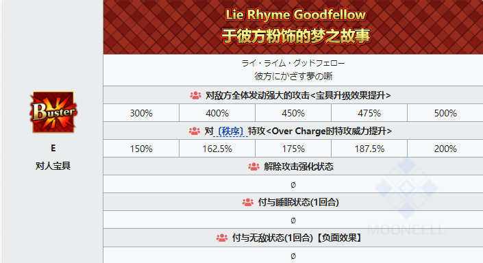 对敌方全体:对敌方全体发动300%~500%的攻击宝具升级效果提升,对〔秩序〕特攻150%~200%Over Charge时特攻威力提升