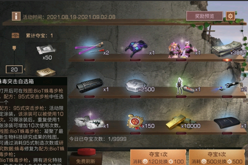 幸运夺宝:8月19日-9月2日8点,消耗集训奖牌可兑换100新币并获赠1次夺宝机会,有机会获取蛛毒突击步枪配方、青鸟号背包等道具;